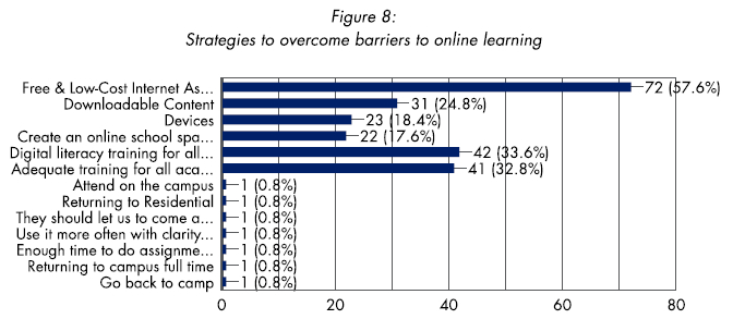 The majority of the students (57,65) feel that free or low-cost internet will assist in online learning. Digital literacy training for both students (33.6%) and academics (32.8%) was also pointed out by a vast number of students to make the transition to online learning. Devices (18.4%), downloadable content (24.8%) and creating an online space for students (17.6%) will make it easier for students in the online learning environment.