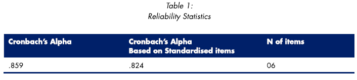The vitality subscale, consisting of six items, was found to be reliable. The value for Cronbach's Alpha for the questionnaire was a =.859.
