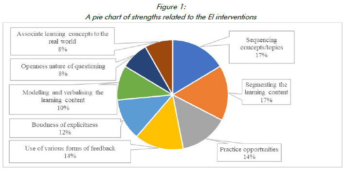 The discussion in this section addresses the rest of this study's research questions. The elements to consider in an instructional strategy for EI have already been presented in Section 2. The strengths and challenges identified are presented in the sub-sections that follow.