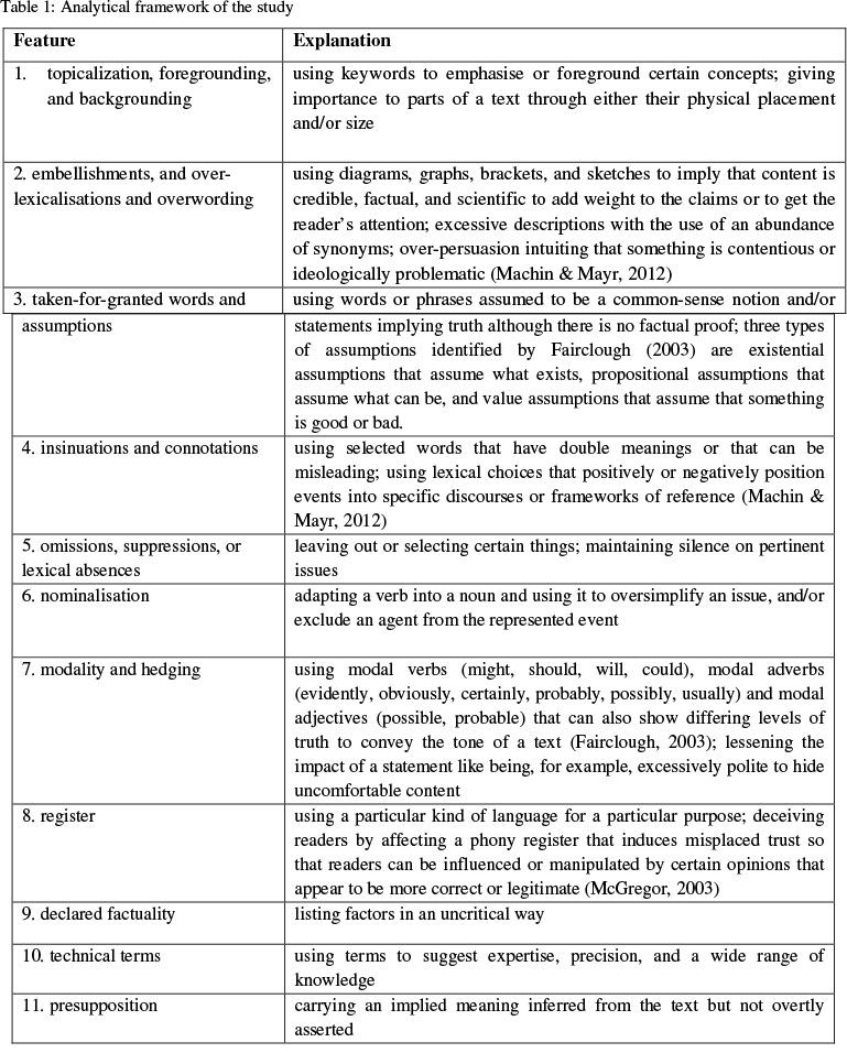 The textual analysis here focuses on the linguistic features of nominalisation, modality, foregrounding and backgrounding, omission, presupposition and assumption, overlexicalisation, and lexical register (Fairclough, 1989; 1992; 2003; Machin & Mayr, 2012). The table below provides an explanation of the analytical framework with the feature in the left column and an explanation in the right.