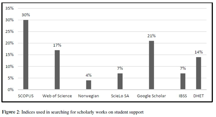 As shown in Figure 2, the majority of identified articles, chapters in books, theses, and other related scholarly works were found in journals hosted by SCOPUS (30%), which proved to be the most valuable index for a scoping review on student support since it pertains to distance education.