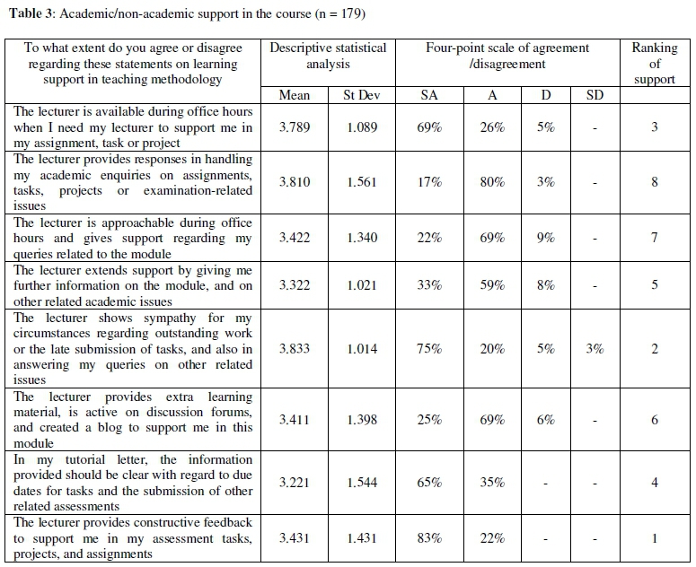 In Table 3, the participants' responses are, in order of preference, lecturer availability (69%), handling of academic enquiries (80%), being approachable (69%), providing extra learning support (69%), showing sympathy (75%), suggesting extra learning materials (59%), giving clear instructions for the module (65%) and providing constructive feedback (73%). The participants awarded the item, "The lecturer for my module provides constructive feedback to support me in my assessment tasks, projects and assignments," top ranking (83%), making it apparent that they viewed the academic support they received from me as the module lecturer in a positive light. Vahed and Cruickshank (2018) report similar results to those outlined in table 3, confirming that providing support to undergraduate students is important for the latter's academic success. Furthermore, these findings revealed that academic support allowed students to become self-directed and successful in their studies. As Blaess and Grant (2010) have noted, psychosocial support must form part of any academic support offered to students if they are to be successful on the academic front.