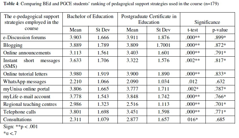 Simple statistical analysis was undertaken to compare groups and to rank the types of pedagogical support strategies lecturers used to enhance students' learning. Table 2 shows that results obtained from students' views were statistically significant (p < 000) in nine of the pedagogical support strategies. Only WhatsApp (.012 >.001; α <.632) and Consultations (.016 >.001; α <.685) are not statistically significant as viewed by students as types of e-tools for pedagogical support strategies used during the course. Both groups agreed that the three most preferred pedagogical support strategies in the module were Online tutorial letters (p <.000**; α>.833), e-Discussion forums (p <.000**; α >.899) and blogging (p <.000**; α>.872). Students agreed that they preferred e-Discussion forums (BEd, mean = 3.903; SD = 1.666; PGCE, mean 3.911; SD=1.876). The results show that pedagogical support strategies have statistical significance in supporting student teachers to achieve learning goals in the module.