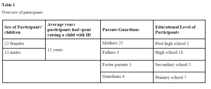 Four schools in Soweto, situated within three kilometres from each other, were involved in this study. All four schools cater for learners with special educational needs. Thirty-five parents of learners who had been diagnosed with ID and who attended one of the four schools at the time participated in our study. Below is an overview table of participants.