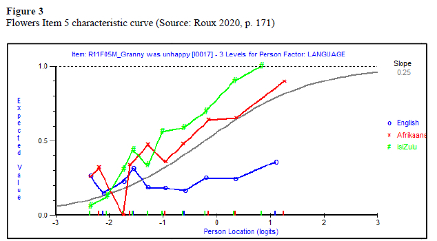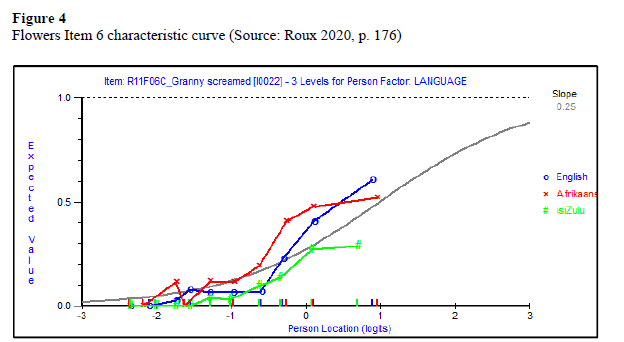 From the results of the item-fit statistics, DIF was conducted on the Flowers on the Roof items completed by the South African Grade 4 students. The ANOVA indicated that the five items functioned differently for the English, Afrikaans, and isiZulu students. These items included problematic responses between the three languages and provided possible evidence of measurement invariance across the Flowers on the Roof items. To gain a better understanding of these problematic items, item curves were conducted. In terms of the DIF and ICC, no clear pattern was observed given that there was no universal discrimination against any one language.