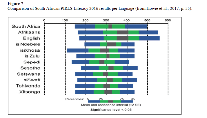 This study only focused on three languages, namely, English, Afrikaans, and isiZulu. In terms of the variation of the mean scores, the greatest variation occurred in English and Afrikaans, which indicates that these two languages have a wider range in achievement compared to isiZulu, whereas isiZulu presented the least variation in terms of mean scores. Moreover, both English and Afrikaans at the 95th percentile achieved over 500 score points, whereas isiZulu obtained approximately 100 score points less (cf. Howie et al., 2017).