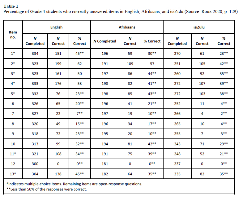This article examines the Grade 4 English, Afrikaans, and isiZulu students' results for the Flowers on the Roof text. Table 1 presents the percentage of English, Afrikaans, and isiZulu students who correctly answered the 13 Flowers on the Roof items. Note that this table indicates the number of students who completed the test items and shows the percentage of students who were able to correctly answer each question. This analysis was conducted prior to the Rasch analysis to provide a snapshot of the specific items that were difficult for students.