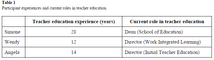 As co-authors of this paper, we currently work together in a School of Education at a metropolitan university situated in south-eastern Australia. Collectively, we represent 54 years of experience in teacher education in a variety of roles ranging from Program Coordination to Directorships to Dean. Individually, our time working in teacher education and current roles are detailed in Table 1 below.