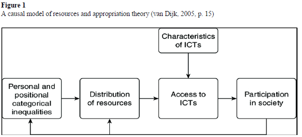 A theoretical model to guide technological literacy for pre-service teachers in teacher education is necessary. This model should provide improved capacity for teachers given that they often face external requirements for their performance and their students' performance (Dlamini & Rekai, 2022; Kimmons & Hall, 2017; Kimmons & Johnstun, 2019). To promote technological literacy, ICT technology integration models should emphasise realistic access to technologies rather than broad concepts or unrealistic technological requirements (Borrero, 2013; Glover et al., 2018; Moll et al., 2022; Pratt et al., 2018). The closest model to combining the technological literacy of the lecturer with ICT usage is van Dijk's (2005) resources and appropriation model (RAT). The RAT model identifies three educational uses of ICT, namely, replacement, amplification, or transformation and shows the connections between four social elements: categorical inequalities, resource distribution, access to ICT, and participation in society (van Dijk, 2005), as indicated in Figure 1 below. It is a theory useful for examining the use of digital tools amidst a lack of resources in a country like Nigeria.