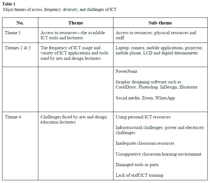 Table 1 shows Theme 1 (access to resources), Themes 2 & 3 (frequency of ICT usage and variety of ICT applications and tools used by lecturers), and Theme 4 (challenges in implementation) together with the sub-themes, which will be analysed and discussed in turn below.
