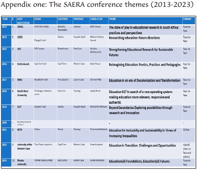 The article is a welcome contribution to the agenda of the 10th SAERA anniversary special issue of the journal since it provides insights into the story of the organisation and its quest to develop a shared democratic space in which divergent researchers might present varied perspectives on selected fields of study. In a historical sense, the article represents the evolution of the organisation in its shifting away from being merely an annual conference assemblage towards becoming an organisation that activates research agendas on an ongoing dialogical elaboration outside the conference, and in many formal and informal spaces. Similarly, the building of the field of Curriculum Studies, like the organisation of SAERA itself, is not confined only to official spaces, and the article signals the varied scope of the field which may or may not be brought into the official realms of conference attendance and participation.