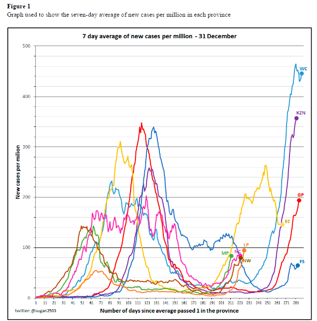 This is an example of a contextual rule that is bounded by the parameters of the COVID context and the interpretation of which depends on coordinating the notion of average with the contextual constraints of a rolling seven-day average as well as understanding that the numbers in the calculation were a rate (new cases by millions). Hence the contextual language used was very dense. Some studies have found that learners find it easier to carry out certain mathematics procedures in a decontextualized setting than when the concept is set within an authentic context (Kosako, 2013; Potgieter et al., 2008). Bansilal (2017) found in a sample of 59 in-service teachers, that 95% were able to carry out a percentage increase calculation correctly in a decontextualized setting, while only 37% could correctly work out how the cost of an item changed if it kept pace with inflation over a two-year period, given the relevant inflation figures. The discussion of the context specific rule for the rolling seven-day average provides some insight into how a concept can become progressively more complex as the constraints of the context are considered. The representation of this information in different curves in one figure was more complex than those that are studied as part of the mathematics curriculum. The purpose of using the graph in Figure 1, taken from the media, was to show to the public the differences in how the disease progressed across various provinces. In contrast, graphs in the classroom are typically used to enhance understanding of mathematical concepts and relationships.