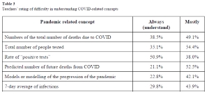 With respect to the knowledge demands related to the pandemic, the teachers found that many of the concepts were mostly or always understandable. They found that concepts dealing with less complex operations, such as counting (e.g., the total number of tests), more easily understandable than those that used more abstract applications of mathematics, such as modelling.