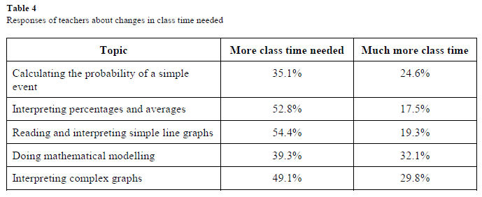 The percentages in Table 4 show that most teachers believed that the amount of time we spend on applying these concepts to real-life contexts was not sufficient. Almost 80% of teachers felt that there was a need for greater emphasis on complex graphs of the type depicted in Figure 1. Teachers did not feel as strongly about extending the time for simpler concepts such as percentages (70%) and for calculating the probability of a simple event (59%), perhaps because they felt that learners understood those concepts well enough.