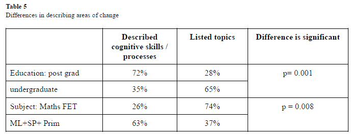 Chi-square tests were used to test the relationship between teachers' tendency to list cognitive skills or topics in describing the curriculum changes and teacher demographic factors and those whose differences were significant are listed below in Table 5.