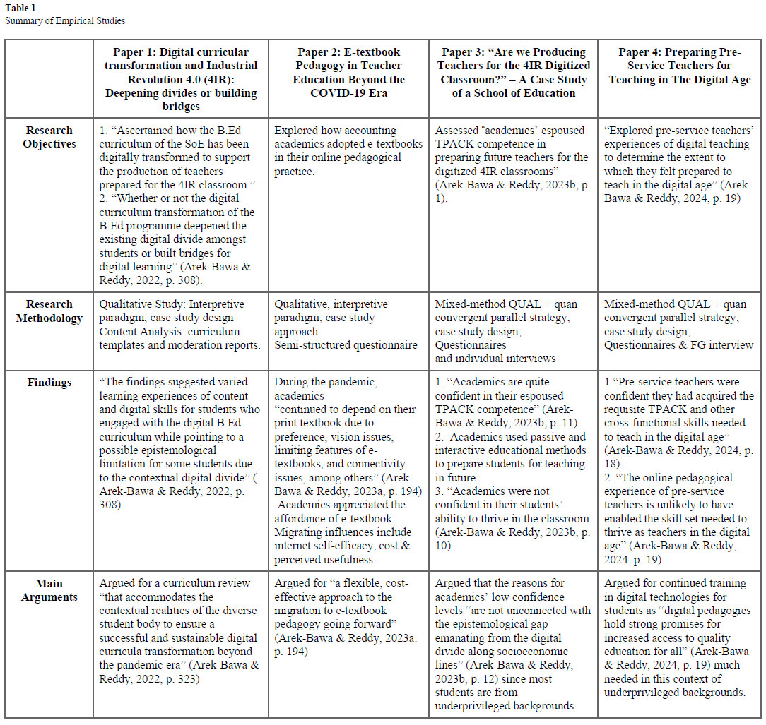 Since the commencement of the project, four empirical studies have emerged from it. The first paper (Arek-Bawa & Reddy, 2022) assessed the digital curricular readiness of the SoE after the COVID-19 pandemic struck. Our findings revealed that the digital B.Ed curriculum offered students mixed education experiences while indicating a likely epistemological limitation for some students resulting from the exacerbated digital divide in South Africa. The second paper (Arek-Bawa & Reddy, 2023a) on e-textbook capabilities in accounting education revealed that academics continually relied on print textbooks in their online pedagogical engagements. The third paper (Arek-Bawa & Reddy, 2023b) suggested that although academics are generally TPACK competent, their remote pedagogical practices may have been insufficient to enable students with the knowledge and skill set needed in the 4IR classroom. The fourth (Arek-Bawa & Reddy, 2024) study on students' experiences of DT revealed that their virtual learning experience is unlikely to prepare them for teaching in the digital age. These studies reveal a weak form of DT incapable of preparing students for their future digitised workplace.