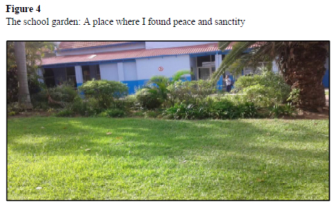 In 2016, I took this photograph of the school garden [Figure 4], and it reminds me of the many unforgettable moments I experienced as a learner in the garden, such as running and trying to catch a butterfly delicately or spotting brightly coloured and furry caterpillars. I would admire the chirping birds, the bustling pigeons, and the buzzing of bees while birds flew around and cooled off in the garden pond. During our daily lessons in the garden, it felt as if we were playing school. The garden was a place that glorified nature and I could not help but admire the lovely plants, flowers, and deep-rooted trees that only became stronger with age. I remember how we appreciated completing several activities under the maduna trees, even though we were fearful and cautious as we were worried that the purple maduna berries might fall on us and stain our uniforms. This outdoor environment was utterly peaceful. I also felt closer to my peers in the garden and gained a sense of belonging there. In the garden we became a learning community that worked happily and collaboratively. The experiences that I gained by learning in another environment other than the classroom, stirred me to organise some lessons outside the classroom environment so as to capture my learners' imagination. I remember the majestic trees' shade and the quiet garden that became a place of refuge when we played hide and seek during lunch breaks. During this game we would choose to hide in or behind the giant trees or find a secluded, shady part of the garden while waiting to be found.