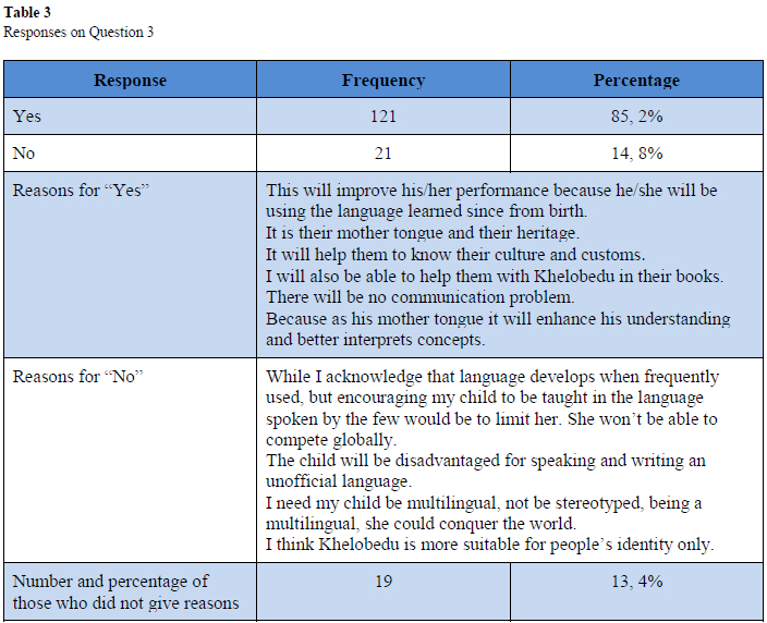 Questions 3 and 4 were grouped under this category since they both relate to the use of Khelobedu as a MoI.