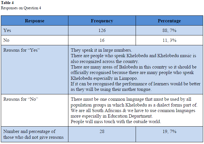 Question 4: Do you think that Khelobedu should be officially adopted as MoI in areas where many learners speak it as, for example, in areas such as Bolobedu?