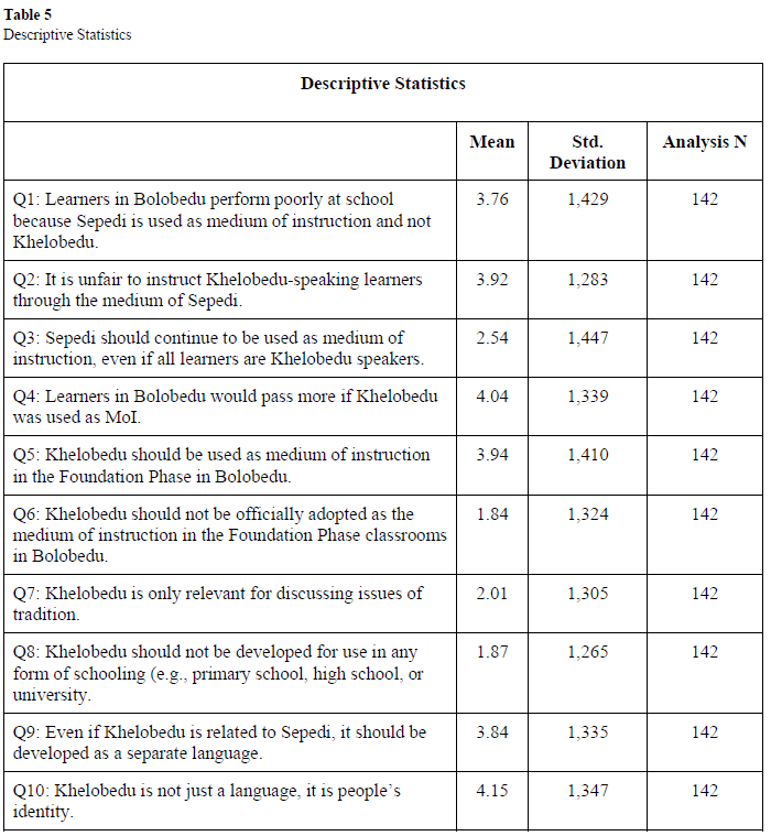 The descriptive statistics above show that Khelobedu-Ll speakers held positive attitudes towards Khelobedu and negative attitudes towards Sepedi. Statement 1 and 2 recorded the mean of over 3.76 and 3.92 respectively, which shows the attitudinal tendency of agreement. This implies that the respondents agree that learners in Bolobedu perform poorly as a result of being taught through the language that is not their own, and they believed that to be an unfair practice which is shown by the mean of 3.92. Regarding the use of Khelobedu as MoI, the respondents showed positive attitudes, which is indicated by the mean of 4.04 and 3.94. These scores imply that the respondents are keen for Khelobedu to be used as MoI. For this reason, they indicated that Khelobedu should be developed as a separate language to be used in schools since they deem it relevant in their children's education.