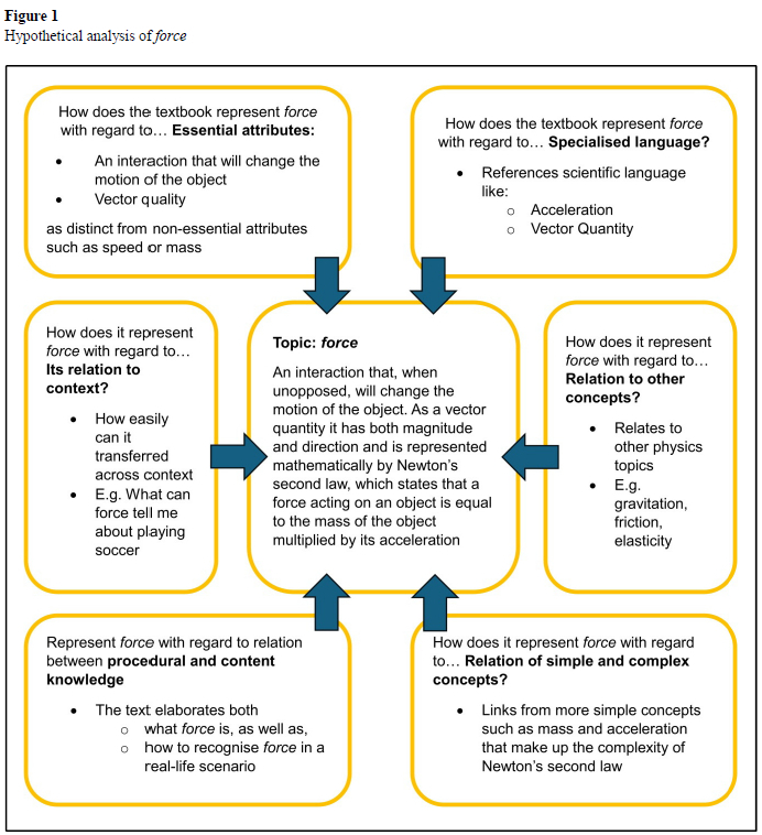 Given the potential of textbooks as mediators of cognitive development, we seek to investigate the extent to which prescribed textbooks outline one specific concept in science- force. We offer a brief caveat here in that we are not suggesting that a textbook can or should be a teacher (Zhu, & Tang, 2023). However, where a teacher lacks knowledge of the content being taught, as is the case in South Africa, they rely heavily in their teaching on what is contained in the textbook (Meza et al., 2022). In the absence of teachers' accurate content knowledge, we suggest that a textbook is a pedagogical aid in the classroom.