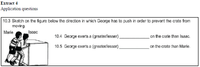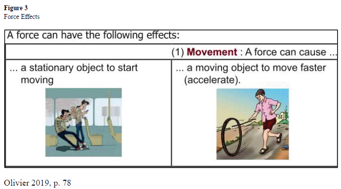 One may suggest that the pictures, for example the one that shows a person pushing toothpaste out of a tube, relate meaningfully to the terms push and pull used to introduce the notion of force but there is no link between the words push and pull and the actions shown in the pictures. The notion of force may have been better represented in the book if each picture had been set as an example of push or pull forces. An experienced teacher could use the pictures to prompt learners' thinking by asking questions such as: "Do you think this is a push or a pull?" and "Can you name other everyday experiences in which we apply force as a pull or as a push?" This level of engagement requires the teacher to go beyond the textbook and use their own initiative in teaching this concept. Where teachers have limited in-depth conceptual knowledge of science content, this will be impossible, and students will struggle to understand what force means (see Spaull, 2015).