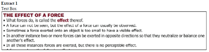 The subsection, The Effect of a Force, is introduced with statements on the attributes of forces before providing the effects of forces, as illustrated in extract 1. The statements explain that even though forces are not visible, their effects usually are. These statements refer to two essential attributes of forces and meet the criteria with a 2/2 score for C1. The terms "forces," "effect," "exert," "neutralise," and "balance" are all accepted specialised scientific terms so here a score of 2/2 is achieved for C2. The mention of a "small force" (2019, p. 76) and forces being exerted in opposite directions relates to magnitude, and direction relates to other science concepts, so scores 2/2 for C3. There is sufficient reference to both content (what the effect of a force is) and procedural knowledge (how to observe and identify the effect) for this to score 2/2 for C4. In stating that some effects of forces are visible, and others may not be, the foundational idea offorce being "conditions dependent" (p. 76) is created that is transferable across various physics contexts, scoring 2/2 for C5. These statements provide a basic understanding of how forces manifest under certain conditions. They make their effects observable and introduce concepts such as types of forces and force diagrams and vectors, thus scoring 2/2 for C6. Thus, these statements constitute a discussion of a simple scientific concept and score 12/12. Scientific language is used well in the analysed statements.