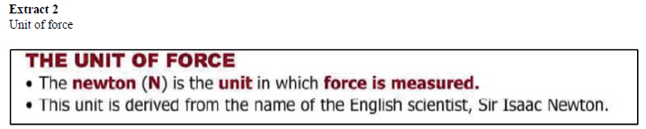 Extract 2 shows the unit of force (Newton, N) that is introduced with captioned illustrations in the textbook.