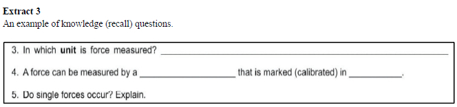 Textbook 1's section on force ends with 28 questions comprising 17 sub-questions. Of the 28 questions most are lower-level knowledge questions, two are comprehension questions, and two are application questions as defined by Bloom's taxonomy outlined in Table 1. That is, 86% of questions were knowledge-type questions as illustrated in extract 3.