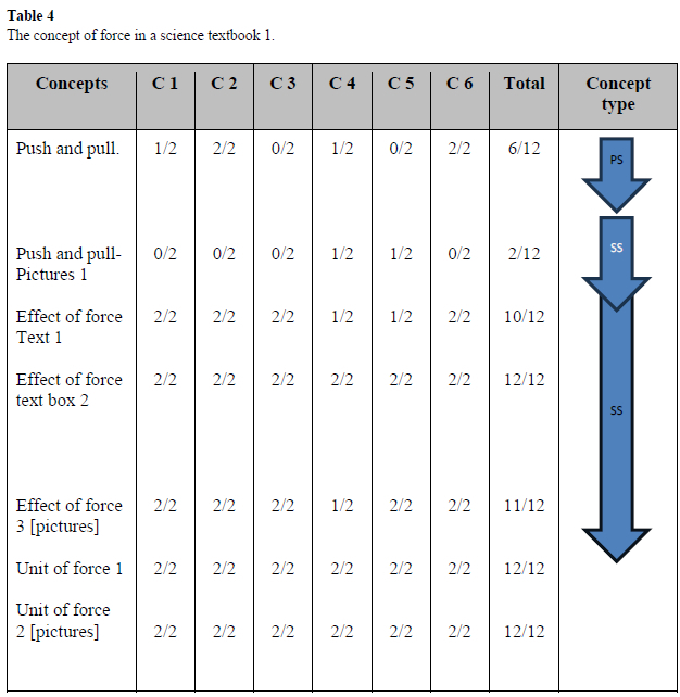 • scoring 4/11 or below indicates that the concept is at the level of the everyday rather than at the level of the simple scientific concept. The location of this concept at the everyday level is partially problematic since it leaves the teacher in control of explicating the concept more fully for the learners. What this means, then, is that in the absence of the textbook making the scientific concept explicit, it is the teacher's responsibility to elaborate the concept. If the teacher does not have sufficient knowledge to do this, there is the potential of severe misunderstandings arising. An example of how one might hypothetically analyse the topic of force is reproduced in Figure 1 below.