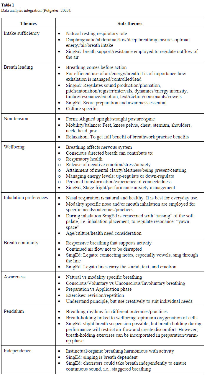 Given the deductive analytic approach, all data was reassembled in line with the ten a priori codes. In this research, the goal was to contemplate and then refine and transform these ten a priori codes to suit the needs of an emergent SingEd breathwork teaching and learning framework. In the process, data that either confirmed, or conflicted with these a priori codes, was identified. Special care was taken to detect codes not included in these ten a priori codes. The fieldwork did not yield sizable data regarding well-being to justify three different entries into an emerging framework, so it was decided to merge the three well-being codes into only one well-being code. This one well-being code was added to the seven Russian Systema codes. A ninth code emerged from the disassembling of the data. This silent code was labelled "breath awareness." Thus, the initial ten a priori codes became nine codes in the final analysis. These codes, in order of prevalence, are intake sufficiency; breath leading; non-tension; well-being; inhalation preferences; breath continuity; awareness; pendulum; and independence. The main themes and subthemes that emerged are captured in Table 1.