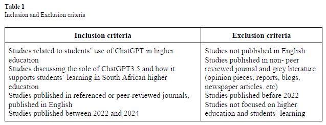 The selection criteria related to the articles included in this systematic review were based on the Preferred Reporting Items for Systematic Reviews and Meta-Analyses Protocols (PRISMA) statement which encourages transparent and complete reporting of systematic review studies (Sarkis-Onofre et al., 2021). The PRISMA detailed criteria can be used by researchers to guide transparent reporting by outlining clearly the data synthesis methods (Sarkis-Onofre et al., 2021). Moreover, PRISMA is comprised of a seventeen-item checklist to ensure scientific reporting of systematic reviews (Moheret al., 2016). In this study, we used four out of the 17 PRISMA checklists to find relevant articles. This includes the identifying of articles from databases, screening of the journal articles, assessing their eligibility, and including only relevant journal articles that address students' use of ChatGPT in higher education. Skimming the journal articles was a manual procedure that included reading the titles, the abstract, and the introduction. We further assessed the eligibility of the journal articles using the inclusion criteria outlined in Table 1. Using PRISMA, we were able to evaluate the quality and relevance of the articles to be included in the study. It also provided uniformity in the procedure followed in accessing and retrieving relevant articles for the study. Our search also focused mainly on mapping existing peer-reviewed literature related to the explored phenomenon. Thus, articles included in this systematic review were selected based on the inclusion and exclusion criteria presented in Table 1.