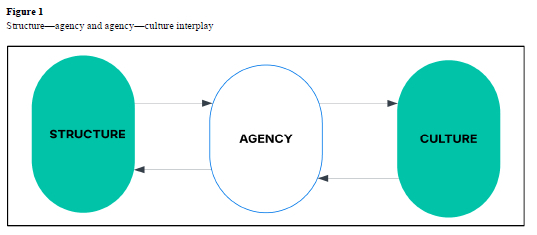 We hinged on the interplay of structure, agency, and culture (Figure 1) to understand the causality of the decline of schools in a township. Considering that these schools previously performed well and later declined suggests a dynamism of structure. Thus, we embrace the belief that action is never-ending and essential both to the continuation and further elaboration of the system. However, subsequent interactions will differ from the earlier actions owing to the structural consequences of prior actions (Archer, 1985).