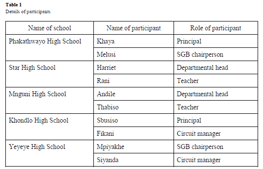We purposefully selected 10 participants, including principals, circuit managers, SGB chairpersons, departmental heads, and post Level 1 teachers, from five declining schools. Two participants were selected per school. These stakeholders were selected based on the key roles they play in schools and the knowledge we deemed they possessed on the studied phenomenon, of school decline (Cohen et al., 2018). In addition to the purposive sampling method, we used convenient sampling and chose five declining schools within close proximity (Etikan et al., 2016). The participating stakeholders were given false names to conceal their identities. Table 1 shows the pseudonyms of the schools and participants, as well as the roles of the stakeholders.