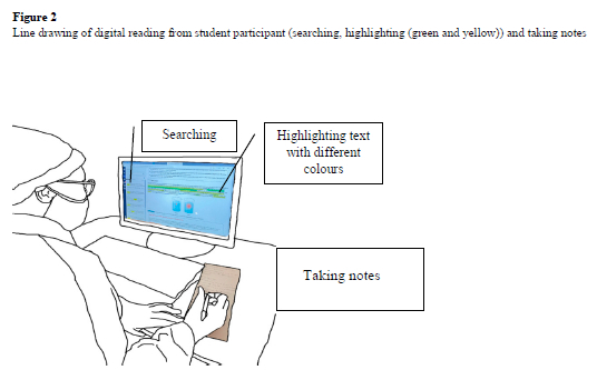 The first category includes moments from the think-aloud protocol and interviews where students read the text and made handwritten notes but did not use the additional affordances of e-textbooks. In these moments, students mainly used conventional ways of reading such as the reading practices that are associated with hard copy texts, as shown in Figure 1 and the two textboxes that follow (1.1 and 1.2), and neglected the affordance features of the e-textbook. In this category, participants showed traditional, or conventional, reading and interaction practices with e-textbooks.