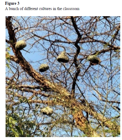 This reminds me of a class with learners from different cultural backgrounds. The branches of the tree are crossing each other which symbolises cultural conflicts within the class. The nests make me to think of learners who are grouping themselves according to their languages and cultures and they are ready to serve their respective communities. The bigger branches make me think of teachers who are short-sighted about cultural beliefs and rigid due to their own values and beliefs.