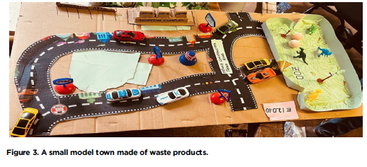 The second story is narrated and analysed based on Figure 3. Here, roads are marked with old bottle tops used as road signs. Toy cars move along the paths, each heading in the correct direction. There is even a zoo with paper fences and tiny animal toys, and a shopping complex built from discarded cardboard off to the side. Participant TE2 observed that: 'What would normally be seen as trash, eggshells, broken toys and leftover cartons, has been carefully transformed into a model town'. This town is not just a creative art project, it is a teaching aid 'made to help teach key Geography topics like road signs, urban features and mapping' (TE4). This visual (Figure 3) tells a powerful story about how sustainability can be lived and taught at the same time. It shows how we can take 'what is usually thrown away and turn it into something useful, meaningful and educational' (TE5). It also shows how Geography education can be more than textbook learning; it can be about making, reflecting and connecting with the environment personally.